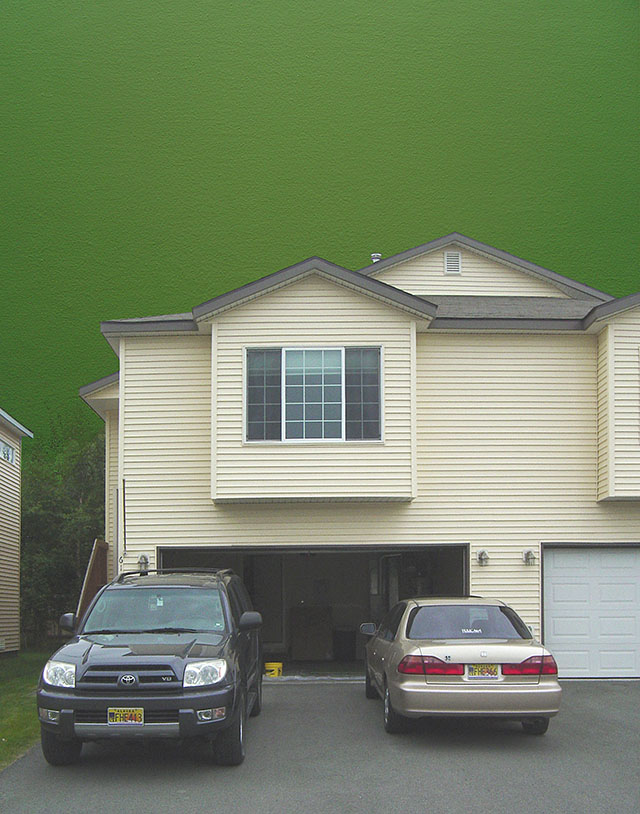 I was commissioned to create a landscape painting for new Anchorage homeowners Mike and Kristin Rutledge. Digital photographs of the home's largest window were taken throughout the Summer Solstice then numerically averaged to determine a particular shade of green: 657B3D. Three wooden panels were constructed to match exactly the size and number of glass panes in the photographed window. Monochromes were then painted with 657B3D. The reduction emphasized in the green wooden panels is a key characteristic of all representational markmaking, of pixel and painted stroke.