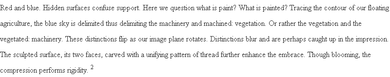 | 4 | Lines, perhaps once black, straight, slightly angled, and radiating from a central hub, now vacillate constructing a translucent, flickering surface. The image plane ebbs and flows in and out of focus, opacity, and consciousness. To look is to struggle, yet this struggle is without strain. The eye receives the sensation readily and calmly while further cognitive responsibilities weigh on other faculties. Thus the struggle is of awareness. Though easy to overlook, this mercurial perception locates articulated and amusing confusion: sensuality.3 |